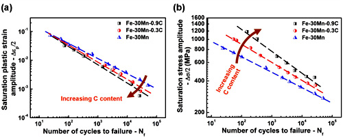 图1. Fe-Mn-C钢的疲劳寿命曲线:(a)塑性应变幅-寿命曲线(Coffin-Mansion公式);(b)应力幅-寿命曲线(Basquin公式)。采用应力与应变作为参数评价材料的疲劳寿命表现出相反的趋势