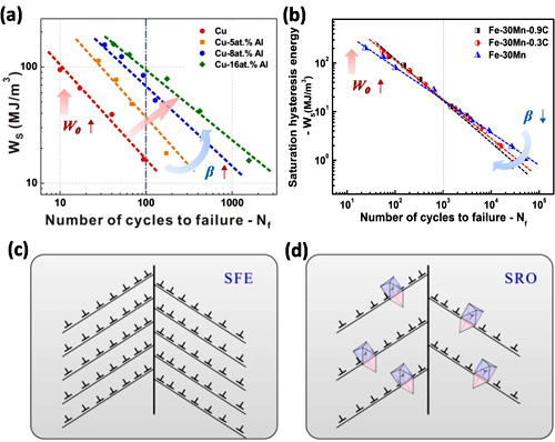 图2. 滞回能模型的应用:(a)Cu-Al合金能量-寿命曲线;(b)Fe-Mn-C钢能量-寿命曲线;层错能(SFE)和短程有序(SRO)对(c) Cu-Al合金微观变形机制与(d)Fe-Mn-C钢微观变形机制影响示意图