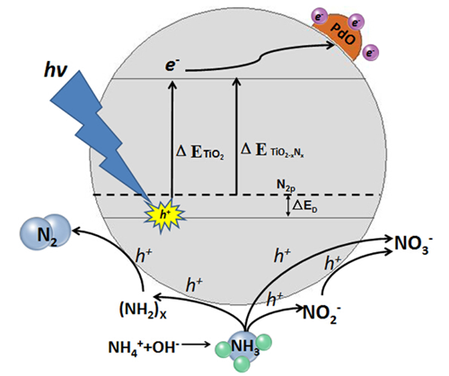 图2 可见光下TiO2-xNx/PdO纳米颗粒光催化去除水中氨氮机理示意图