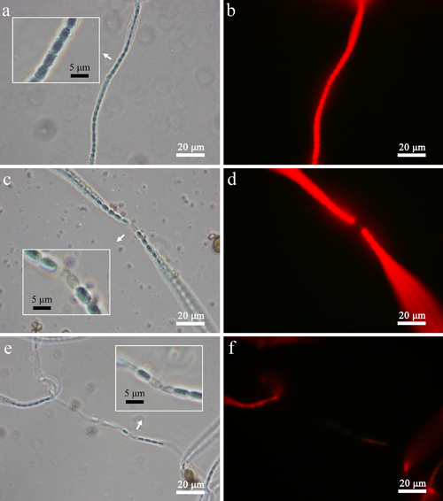 图3 可见光照射不同时间后(a/b: 0小时、c/d: 3小时、e/f: 6小时)蓝藻细胞链被TiO2-xNx/PdO薄膜光催化氧化破坏情况,a、c、e与b、d、f分别为对应的原位实时相差与荧光显微照片