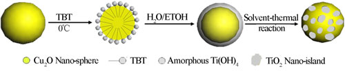 图1 二氧化钛“纳米岛”修饰的氧化亚铜纳米球光催化材料的合成路线图。