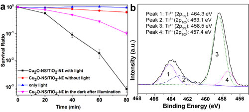 图3 (a) 大肠杆菌仅在可见光光照下(蓝色)、被Cu2O/TiO2样品在黑暗中(红色)、光照下(黑色)、以及事先光照3小时后再在黑暗中处理(玫红色)后的存活率;(b) 可见光照下,Cu2O/TiO2样品的XPS高分辨Ti 2p谱。