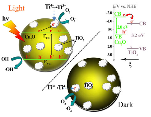 在前期工作的基础上,他们通过对光催化“记忆”效应机制与有效活性基团的研究,近期在光催化“记忆”效应研究上取得了重要进展。他们发现,贵金属修饰不是光催化“记忆”效应所必需。根据半导体材料的能带结构,通过选择具有电子存储能力的材料,进行适当的材料结构与能带的匹配,可以在多种光催化纳米材料体系中实现光照下光生电子的富集、存储与光照关闭后的释放,从而获得性能更为优异、成本更低的具有“记忆”效应的高效光催化净水材料。在此机制研究成果的指导下,他们研发出第二代具有“记忆”效应的光催化材料——二氧化钛“纳米岛”修饰的氧化亚铜纳米球光催化材料。在合成氧化亚铜纳米球的基础上,通过吸附、控制水解与溶剂热反应在氧化亚铜纳米球上生成非连续的二氧化钛“纳米岛”。在此材料体系中,p型氧化亚铜纳米球上构筑了n型二氧化钛“纳米岛”,形成纳米p-n结结构。p型氧化亚铜纳米球可以吸收可见光,产生电子-空穴对。二氧化钛纳米岛的导带能级低于氧化亚铜纳米球的导带能级,光生电子能够从氧化亚铜转移到二氧化钛;同时界面形成的纳米p-n结产生的内建电场也促使光生电子从氧化亚铜转移到二氧化钛,从而更加有效分离电子-空穴对。在实现有效分离电子-空穴对的同时,二氧化钛纳米岛上的Ti4+可被还原为Ti3+而进行光生电子(即光能)的存储;在光照关闭后,通过释放电子产生超氧与羟基活性基团,产生光催化“记忆”效应(ACS Applied Materials & Interfaces, 2014, 6, 5629)。