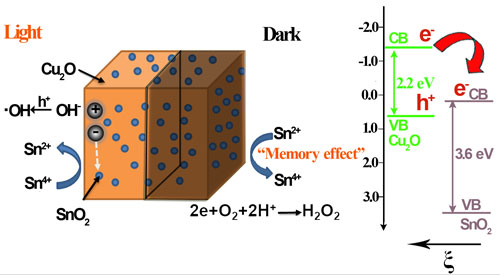 图5 Cu2O/SnO2 p-n结结构、能带匹配示意图与光催化“记忆”效应原理图。