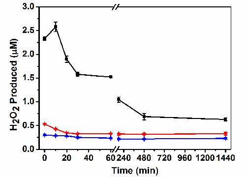 图7 光照关闭后,Cu2O/SnO2样品(黑色)、Cu2O 纳米单晶(红色)与SnO2 纳米颗粒(蓝色)黑暗中在测试溶液中产生双氧水的浓度。