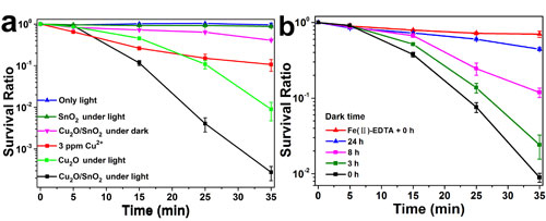 图6 (a)光照条件下金黄色葡萄球菌在Cu2O/SnO2样品光催化杀菌等处理方式下的存活率;(b) 光照关闭后,金黄色葡萄球菌在黑暗中放置不同时间后Cu2O/SnO2样品处理后的存活率。