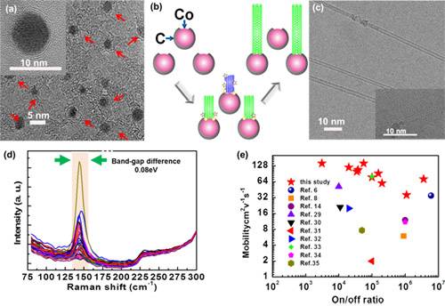 图 (a) 部分碳包覆Co催化剂的TEM照片;(b)窄带隙分布半导体性SWCNT的生长示意图;(c)所得SWCNT的TEM照片;(d)所得半导体性SWCNT的激光拉曼光谱图(激发光波长为532 nm);(e)以所得SWCNT为沟道材料制备的薄膜晶体管的器件性能。
