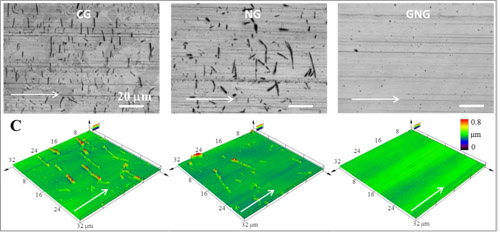 机械运转时材料之间的摩擦会造成能量的损耗机械、工作效率降低及部件寿命缩短。减小摩擦的方法往往只能依赖添加润滑或在部件表面进行减摩涂层处理。材料本体在一定工况条件下的摩擦系数难以通过结构调控而改变。例如:金属材料的干摩擦系数普遍较高,通常处于0.6-1.2之间,主要原因是摩擦过程中接触表面下方产生塑性变形,变形的不均匀性导致表面粗糙化以及形成易脱落的摩擦层。即使将晶粒尺寸降低到纳米量级,材料的硬度成倍提高,但稳态摩擦系数却几乎不变,这是由于纳米材料有限的塑性变形能力使其在摩擦过程中容易发生应变局域化。降低金属材料本体的摩擦系数似乎成为了一个“不可能完成”的任务。