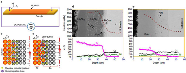 图1(a)涡流电迁移渗铝示意图,(b)直流和(c)脉冲电流示意图,(d)直流和(e)脉冲电流渗铝层(10min)截面及显微硬度、元素分布