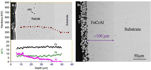 图2(a)FeCrAl渗层(5min)截面及显微硬度、元素分布,(b)新型料浆生长的厚FeCrAl(5min)渗层