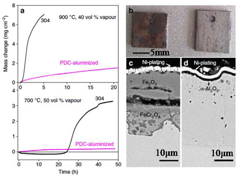 火电在我国近三年发电量所占比例为七至八成。自1995年我国建成首座超临界大型电站以来,超超临界洁净燃煤电站已成为我国火电主流。目前正在推行700oC超超临界火力发电技术计划,以进一步提高发电效率,降低CO2排放,其目标参数为:压力≥35MPa,温度≥700oC。锅炉运行参数和发电热效率的提高,对锅炉高温段耐热钢管道内壁抗超临界水氧化性能的要求也显著提高。20多年电站运行经验表明,传统耐热钢在超临界电站中的寿命远低于亚临界电站,其原因是氧化铬膜在超临界水环境中更易于剥落和挥发,导致Cr合金元素快速消耗而出现灾难性氧化。国际上提出了两个方案,一个是含铝耐热钢,另一个是管材低温渗铝。到目前为止,这2个方案都没有得到大规模应用,主要原因是含铝耐热钢加工和焊接性能不足,低温渗铝很难避免裂纹。欧洲推行的“Coatings for Supercritical Steam Cycles”(SUPERCOAT)研究计划表明,低温渗铝层为多层金属间化合物脆性相层,涂层组织和涂层厚度对热扩散温度非常敏感。因此,研究出适用于耐热管材内表面的新型抗超临界水氧化涂层技术十分紧迫。