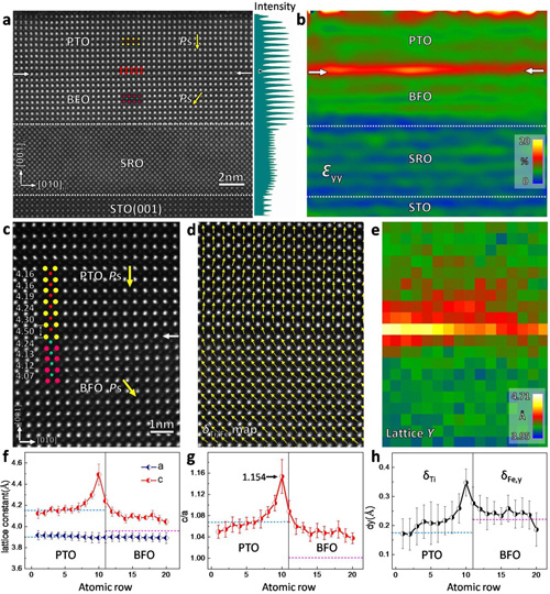 图1、BiFeO3/PbTiO3薄膜界面处的晶格参数,应变和离子位移分析。在BiFeO3/PbTiO3界面附近,不仅面外晶格参数(c)显著拉长,Ti和Fe沿面外方向的离子位移(δTi,δFe)也显著增大,预示界面附近PbTiO3中铁电极化显著增大。