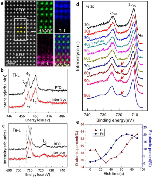 图3、BiFeO3/PbTiO3界面的电子能量损失谱(a-c)和X射线光电子谱(d-e)分析表明,在BiFeO3/PbTiO3界面处存在氧空位聚集以及Fe3+向Fe2+的转化。