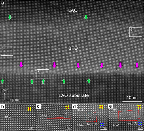 图1:LaAlO3/BiFeO3/LaAlO3(001)纳米结构沿[100]的HAADF-STEM成像。(a)原子分辨率HAADF-STEM成像;四处典型矩形区域标号为1,2,3和4。(b)-(d)分别为对应1,2,3和4号矩形区域的放大像。注意(b)和(c)之间的相对晶格旋转,表明BiFeO3纳米结构中可能存在沿面内方向的连续晶格旋转。粉色和绿色箭头分别示意两类不同伯氏矢量的位错,其位错核心区域如(d)和(e)所示。