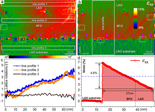 图2:(a)LaAlO3/BiFeO3/LaAlO3(001)纳米结构中晶格旋转(ω)和(b)面内应变(εxx)的二维分布。(c)对应(a)中的三处白色矩形区域沿面内方向晶格旋转线分布。(d)对应(b)中的白色矩形沿面外方向应变线分布。注意BiFeO3和LaAlO3中都产生了明显的晶格旋转;同时还产生了沿面外方向的线性应变梯度,可达106/m。