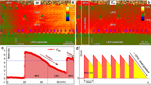 图3:(a)BiFeO3/LaAlO3/BiFeO3/LaAlO3(001)纳米结构中晶格旋转(ω)和(b)面内应变(εxx)的二维分布。(c)对应(b)中的白色矩形沿面外方向应变线分布。注意在整个BiFeO3/LaAlO3/BiFeO3三层纳米结构中都产生了明显的晶格旋转及其伴随的沿面外方向的线性应变梯度;除了第一层BiFeO3/LaAlO3(001)由高通量沉积制备的界面,其它界面都只有弛豫失配应变的a[010]位错,没有弛豫晶格旋转的a[011]位错,从而使得线性应变梯度能够在整个三层纳米结构中得到保持。(d)为在循环BiFeO3/LaAlO3纳米结构中保持这种线性应变梯度的原理示意图。