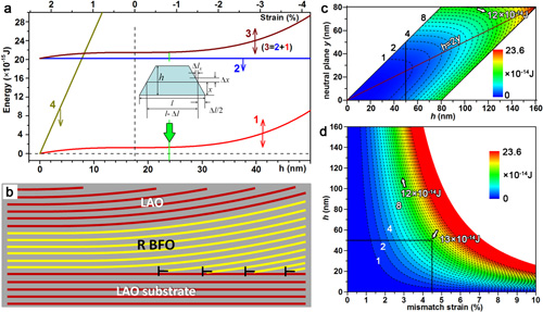 图4:BiFeO3纳米“向错”弹性能计算及其与均匀应变状态下的比较。(a)均匀应变和应变梯度下同样尺寸BiFeO3纳米结构弹性能随厚度变化趋势。曲线1为应变梯度下BiFeO3纳米结构的弹性能;曲线2为BiFeO3/LaAlO3界面失配位错阵列的弹性能;曲线3为界面失配位错阵列的弹性能和应变梯度弹性能的加和,即3=1+2;曲线4为BiFeO3纳米结构在均匀失配应变下的弹性能。值得注意的是,和均匀应变下弹性能相比,应变梯度下BiFeO3纳米结构的弹性能在50nm厚度范围内几乎可以忽略不计。(b)为BiFeO3/LaAlO3纳米结构中由a[001]面外分量产生向错的示意图。(c)和(d)分别为应变梯度下和均匀应变下BiFeO3纳米结构应变能随薄膜厚度和中性面或失配应变大小的演化规律。可以看出,在大失配体系下,如BiFeO3/LaAlO3体系,其向错应变梯度引起的弹性能在纳米尺度范围内远远小于均匀失配应变导致的弹性能。