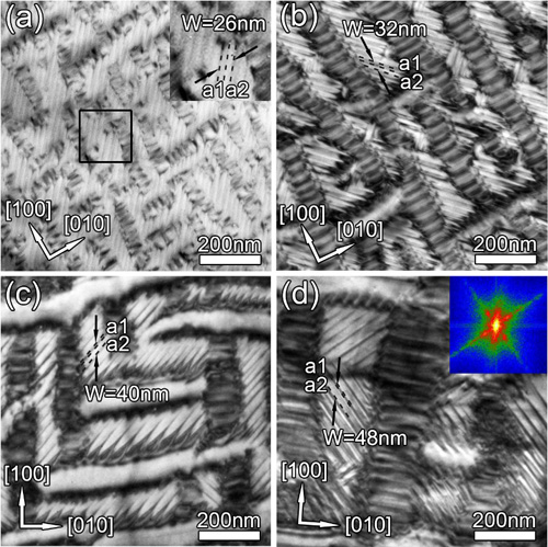 图3: 正交GdScO3(110)衬底上沉积的(a) 22nm (b) 43nm (c) 54nm (d) 86nm厚的PbTiO3薄膜中a1/a2 畴的演变。