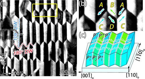 图2:生长在正交PrScO3(110)衬底上的BiFeO3薄膜中周期性大规模四组态涡旋畴结构。 (a) 平面样品暗场像;(b, c) 四组态畴壁处极化矢量的可能分布状态。