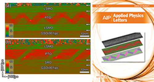 图4:(a) 对称氧化物电极夹持PbTiO3铁电薄膜中的周期性闭合畴结构;(b) 非对称氧化物电极夹持PbTiO3铁电薄膜中的交替的ac畴结构。右图:封面文章