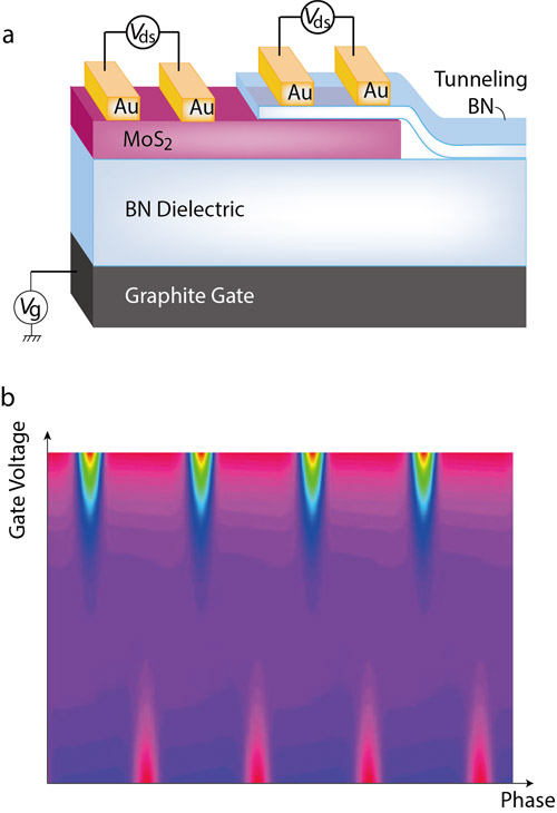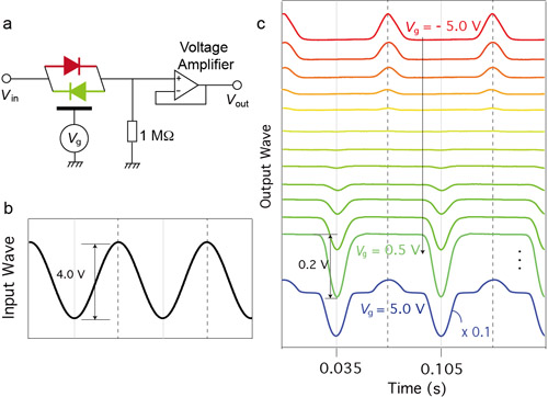 图1 a) MoS2隧穿晶体管示意图;b) 输入正弦波在门电压调制下的双向整流效应