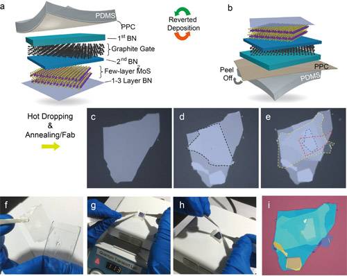 耀彩网磁性材料与磁学研究部研究人员发明了倒置范徳华堆垛的新方法(图2)。解决了传统范徳华垂直异质结构难以获得高质量超薄顶层的结构性难题,目前已申请中国专利一项。基于上述倒置转印范徳华堆垛的制备方法,耀彩网研究人员以少数层二硫化钼(MoS2)为研究体系,利用超薄(少数原子层)的六方氮化硼(h-BN)作为范德瓦尔斯异质结的隧穿层,系统开展了隧穿晶体管器件研究。研究表明,通过在金属(Au)和半导体(MoS2)界面之间引入隧穿h-BN,可有效降低界面处的肖脱基势垒,从而实现通过局域石墨背栅的对通道MoS2费米能级的精确静电调控(图3)。