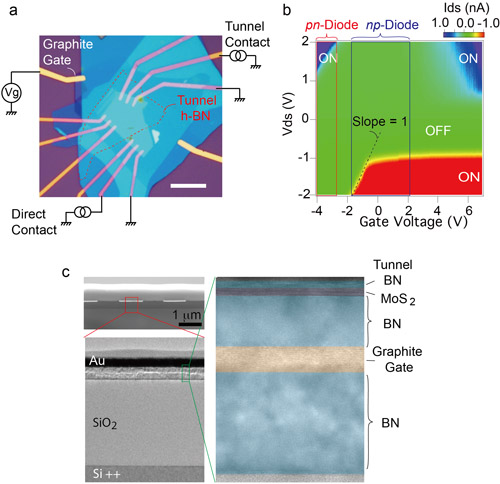 图3 a) MoS2隧穿晶体管光学照片;b) 器件在源漏偏压和门电压参数空间中的输出电流特性; c) 样品的垂直截面透射电镜图像