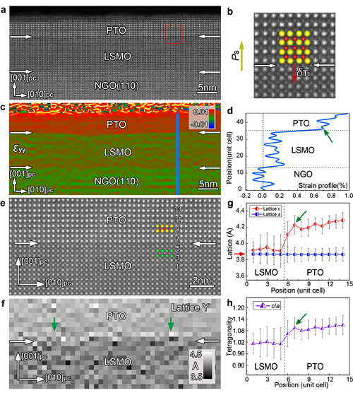 图1、3.6nm PbTiO3/La0.7Sr0.3MnO3薄膜界面处的晶格参数和应变分析。显示出PbTiO3/La0.7Sr0.3MnO3薄膜界面处面外晶格常数(g)以及四方性(h)显著增加。