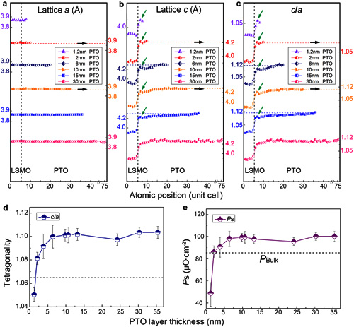 图2、不同厚度(1.2nm, 2nm, 6nm, 10nm, 15nm)PbTiO3薄膜的晶格常数(a、b)以及四方性(c)变化,PbTiO3/La0.7Sr0.3MnO3界面处都存在面外晶格显著拉长现象,四方性(d)以及(e)随着厚度的变化显示出当薄膜厚度为1.2nm时极化强度为50μC cm−2。