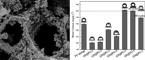 石墨烯基多孔材料一般可以通过化学气相沉积、电化学沉积以及冷冻干燥等方法获得。研究人员以聚氨酯海绵为模板,将其分别浸入含微量纳米纤维素的石墨烯以及纯石墨烯水性分散液,制备出超疏水聚氨酯海绵。该海绵对各类油品具有良好的吸附能力,在油水分离领域有良好的应用前景。相关结果见Appl. Surf. Sci. 422 (2017) 116–124。
