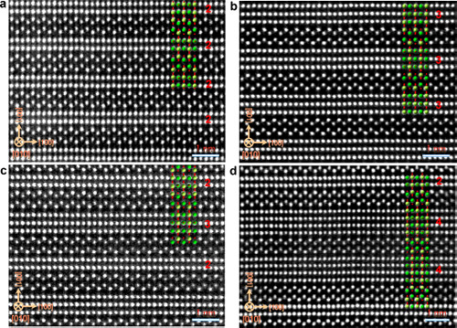 图1、SrnNbnO3n+2化合物沿[010]晶带轴的HAADF像。所有化合物均由交替排列的链条状区域和锯齿状区域构成。 (a) 2-2-2-2型结构,对应于n = 4 (i.e. SrNbO3.5); (b) 3-3-3-3型结构,对应于n = 5 (i.e. SrNbO3.4); (c) 2-3-2-3型结构,对应于n = 4.5 (i.e. SrNbO3.45); (d) 2-4-4-2型结构,对应于n = 4, 6, 6, 4 (i.e. SrNbO3.4)。