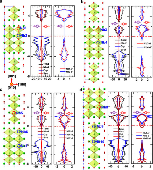 图3、SrnNbnO3n+2化合物的优化结构模型、TDOS及Nb-4d DOS。(a) 2-2-2-2型结构; (b) 3-3-3-3型结构; (c) 2-3-2-3型结构; (d) 2-4-4-2型结构。DOS的结果表明3-3-3-3型结构、2-3-2-3型结构与2-4-4-2型结构为二维导体,2-2-2-2型结构为绝缘体。