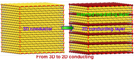 图5、制备二维导电材料的示意图:往三维导体中引入绝缘层,使其由三维导电转变为二维导电。