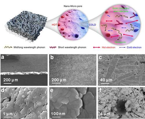 该团队首次采用非平衡磁控溅射技术,以纤维素纸为基体,制备具有微米至纳米多尺度孔隙结构的碲化铋复合热电薄膜材料,如下图所示。
