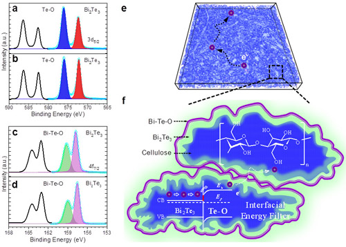 图 XPS分析多尺度孔隙碲化铋复合材料以及3D纳米X射线成像分析复合薄膜材料以及界面能垒过滤低能载流子效应示意图