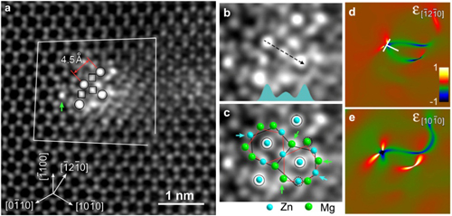 图1、冷轧后,300℃热处理约5分钟的样品中位错芯处的原子构型。(a-c)沿着Mg基体[0001]晶带轴观察到Zn原子在柱面位错处的偏聚,部分原子进入八面体间隙(圆圈所示位置)形成不完整的二十面体结构;(d,e)位错周围的应变场。