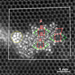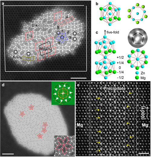 带轴观察得到的析出相的原子分辨图像,显示大量Zn间隙原子(如箭头所指)。图a中标出了C14、C15、μ和Mg4Zn7等晶体相的结构单元,但它们的尺寸通常不超过一个单胞大小。