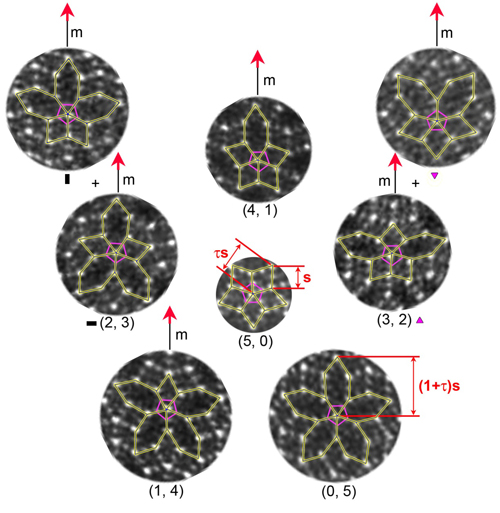 图4、析出相中显示理想的五次旋转对称性的二十面体串(紫色五边形所示)处的四棱柱和扁六棱柱排列规律。m代表对称元素—“镜面”,s代表相邻两个共面二十面体之间的距离(~0.45nm),