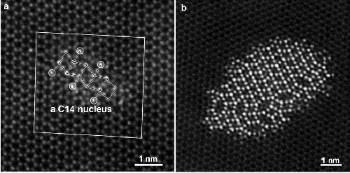 图5、(a)均匀形核的晶核显示C14 Laves相结构;(b)均匀形核长大的析出相内往往存在较大的晶体畴结构,畴的尺寸远大于晶体相单胞大小。由此推断,位错芯处的五元环结构在类Penrose随机拼接结构析出相的形成中发挥了重要作用。