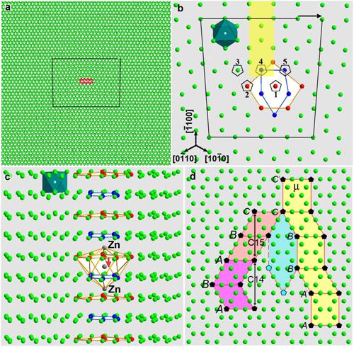 图6、(a-c)Mg柱面位错芯结构的分子动力学动力学模拟,其中:图b中的数字1-5标出了五元环中心的原子柱,图c中示意地勾勒出Zn原子进入间隙后与位错芯出的五元环构成的一个二十面体团簇;(d)以Mg八面体中心为轴的二十面体串(黑色五边形)在Mg基体晶格中构成四棱柱和扁六棱柱的示意图。