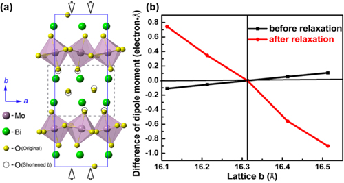 图1. (a)Bi2MoO6晶格结构示意图;(b)Bi2MoO6极性方向晶格常数b的变化对材料偶极矩影响的DFT理论计算结果。