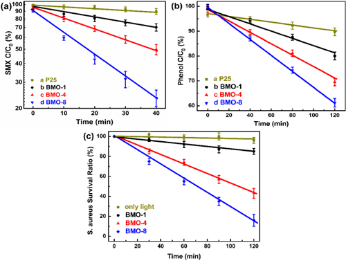 图4. Bi2MoO6系列样品的(a)抗生素、(b)苯酚与(c)金黄色葡萄球菌可见光光催化净化效果。