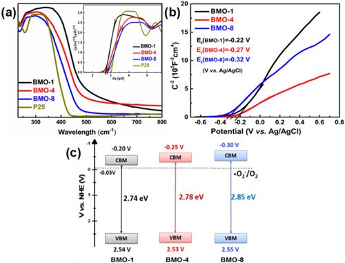 图2. Bi2MoO6系列样品的(a)光吸收特性、(b)Mott-Schottky图与(c)能带结构。