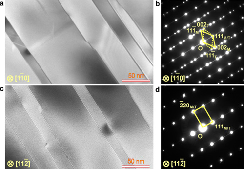 图1、Fe3O4孪晶沿着两垂直晶带轴的透射电镜明场像与电子衍射谱。