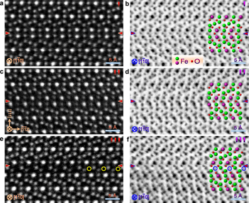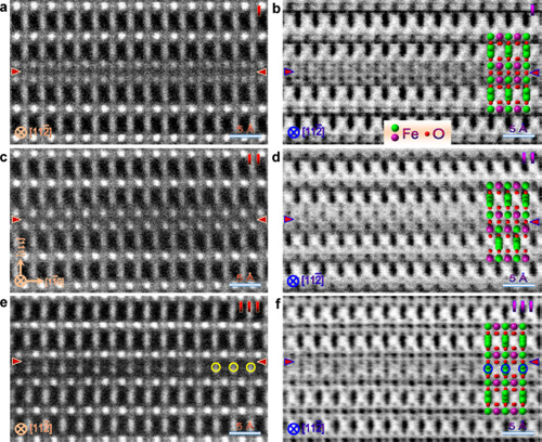图3、Fe3O4孪晶沿晶带轴的原子结构。(a, c, e) I、II、III型孪晶的HAADF像;(b, d, f) 相应的ABF像。图中红色箭头表示孪晶界面,图(e, f)中的圆圈表示Fe空位。
