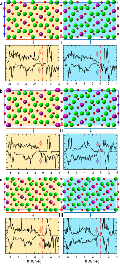 图4、Fe3O4孪晶自旋极化态密度图(DOS)。态密度计算结构显示I型孪晶界面为铁磁耦合,II、III型孪晶界面为反铁磁耦合。