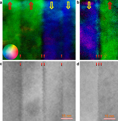 图5、Fe3O4孪晶界面磁性耦合的测定。(a, b) DPC STEM实验测得的Fe3O4孪晶板条的面内磁化矢量分布图,(c, d) 对应的透射电镜明场像。I型孪晶界两侧的磁化矢量方向相同,为铁磁耦合;II、III型孪晶界两侧磁化矢量相反,为反铁磁耦合。