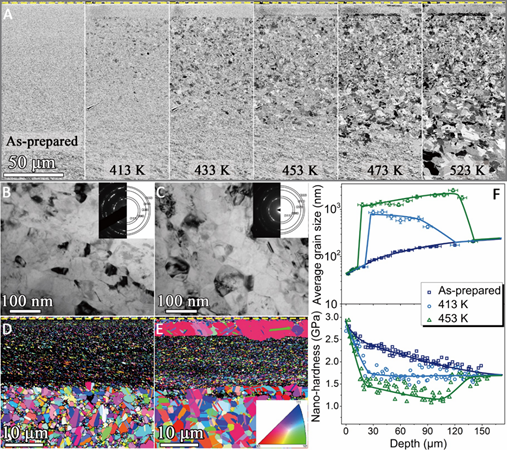 图1 退火引起的梯度纳米结构纯铜的组织变化。(A) 制备态(左)以及不同温度退火30分钟后的样品横截面的SEM照片,虚线处为样品表面。(B)和(C)分别为距表面2mm处的样品退火前和433K退火30分钟后的TEM照片及电子衍射图。(D)和(E)为梯度样品433K退火和473K退火30分钟后的最表面组织EBSD图。(F)制备态、413K和453K退火30分钟后样品的平均晶粒尺寸及硬度随深度分布。