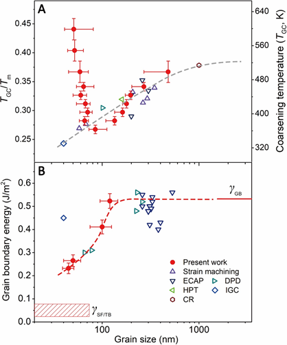 最近,沈阳材料科学国家研究中心、国家级人才计划科学家工作室卢柯研究员、李秀艳研究员及其指导的中国科学技术大学材料学院研究生周鑫的研究发现,对于塑性变形制备的纳米晶,其显著不稳定只在一定的晶粒尺寸范围内发生,之后随着晶粒尺寸的降低,其稳定性不降反升。对于纯铜而言,尺寸为70nm的晶粒在413K退火30分钟即发生显著长大,远低于粗晶铜的再结晶温度。而低于70nm,随着晶粒尺寸的进一步减小,纳米晶的稳定性反有所上升,尺寸为30nm的晶粒,其显著长大温度甚至高达600K以上。研究发现,低于70nm晶粒稳定性升高来自于晶界能的自发降低。塑性变形过程中,70nm以下,晶界能自发由原来0.52J/m2降低至0.23-0.27J/m2,这一现象与在该尺寸下全位错不能弓出,晶界通过释放不全位错容纳变形有关。不全位错的释放改变了晶界的结构,使之向低能状态转变。