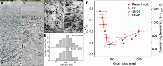 图3(A)和(B)分别为梯度纳米纯Ni制备态及873K退火30分钟后的SEM照片。虚线处为样品表面。(C)、(D)、(E)分别为距离表面25mm处制备态和873K退火30分钟后的TEM照片及两者的晶粒尺寸分布图。(F)晶粒粗化温度随晶粒尺寸变化图。HPT: 高压扭转, ECAP:等通道挤压, SMGT:表面机械碾磨。